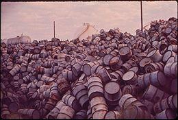 In the past, hazardous waste was often placed in drums of this size and stored in open fields or buried. Over time, some drums would corrode and leak. As a result, these drums have become iconic of pollution problems, even though they have numerous uses and are ubiquitous in commerce. Drums are often cleaned or re-conditioned and then used for storing or shipping various liquids or materials.