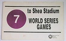 The 7 was the last service to run using "Redbird" cars, and the 7's fleet consisted entirely of R33S/R36 trains until December 2001. In 2001, with the arrival of the R142/R142A cars, the Transit Authority announced the retirement of all Redbird cars. From January 2002 to November 2003, the Bombardier-built R62A cars, which used to operate on the 3 and 6, gradually replaced all of the Redbird cars on the 7. On November 3, 2003, the last Redbird train made its final trip on this route, making all stops between Times Square and the then-named Willets Point–Shea Stadium.[71] Several Redbird cars running on this service were decorated with Mets logos and colors during the 2000 World Series against the New York Yankees, as the Flushing Line runs adjacent to Citi Field and the former location of Shea Stadium.[72]