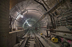 The 7 Subway Extension, which travels west and south to 34th Street and 11th Avenue, near the Jacob K. Javits Convention Center in Hudson Yards, was delayed five times.[52] The 34th Street–Hudson Yards station, originally scheduled to open in December 2013, began serving passengers on September 13, 2015.[53] However, the overall station construction project was not completed until early September 2018.[54][55][56]