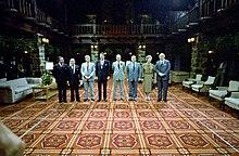 The Group of Seven (G7) was an unofficial forum which brought together the heads of the richest industrialized countries: France, West Germany, Italy, Japan, the United Kingdom, the United States, Canada (since 1976)[2] and the President of the European Commission (starting officially in 1981).[3] The summits were not meant to be linked formally with wider international institutions; and in fact, a mild rebellion against the stiff formality of other international meetings was a part of the genesis of cooperation between France's President Giscard d'Estaing and West Germany's Chancellor Helmut Schmidt as they conceived the first Group of Six (G6) summit in 1975.[4]