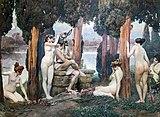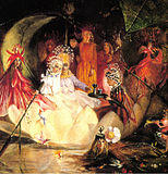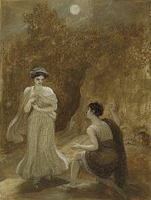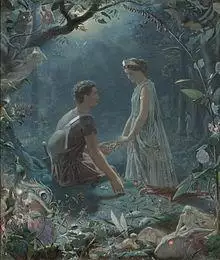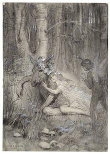 Gervinus also wrote on where the fairyland of the play is located. Not in Attica, but in the Indies. His views on the Indies seem to Kehler to be influenced by Orientalism. He speaks of the Indies as scented with the aroma of flowers and as the place where mortals live in the state of a half-dream. Gervinus denies and devalues the loyalty of Titania to her friend. He views this supposed friendship as not grounded in spiritual association. Titania merely "delight in her beauty, her 'swimming gait,' and her powers of imitation".[35] Gervinus further views Titania as an immoral character for not trying to reconcile with her husband. In her resentment, Titania seeks separation from him, which Gervinus blames her for.[35]