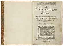 The play was entered into the Register of the Stationers' Company on 8 October 1600 by the bookseller Thomas Fisher, who published the first quarto edition later that year.[4] A second quarto was printed in 1619 by William Jaggard, as part of his so-called False Folio.[4] The play next appeared in print in the First Folio of 1623. The title page of Q1 states that the play was "sundry times publickely acted" prior to 1600.[5] The first performance known with certainty occurred at Court on 1 January 1604.