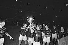 In 1908, Milan experienced a split caused by internal disagreements over the signing of foreign players, which led to the forming of another Milan-based team, F.C. Internazionale Milano.[19] Following these events, Milan did not manage to win a single domestic title until 1950–51.[9] The 1950s saw the club return to the top of Italian football, headed by the famous Gre-No-Li Swedish trio Gunnar Gren, Gunnar Nordahl and Nils Liedholm. This was one of the club's most successful periods domestically, with the Scudetto going to Milan in 1951, 1955, 1957, 1959 and 1962.[9] In 1963, Milan won its first continental title by beating Benfica in the final of the European Cup.[20][21] This success was repeated in 1969, with a 4–1 win over Ajax in the final, which was followed by the Intercontinental Cup title the same year.[9] During this period Milan also won its first Coppa Italia, with victory over Padova in the 1967 final, and two European Cup Winners' Cups: in 1967–68 and 1972–73.[9]