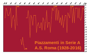 In the years just after the war, Roma were unable to recapture their league stature from the early 1940s. Roma finished in the lower half of Serie A for five seasons in a row, before eventually succumbing to their only ever relegation to Serie B at the end of the 1950–51 season,[7][13] around a decade after their championship victory. Under future Italy national team manager Giuseppe Viani, promotion straight back up was achieved.[14]