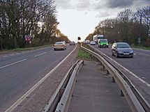 The road then climbs up onto the Downs via Detling Hill, past the village of Detling and crossing the Pilgrim's Way and North Downs Way (between Boxley and Thurnham). Just after the M20 junction where it meets Pilgrim's Way, is a footbridge called Jade's Crossing, named after the schoolgirl who died along with her grandmother in a road accident in 2000 whilst attempting to cross the busy road in the absence of such a bridge.[2] Immediately after the footbridge, the carriageways diverge, with the northbound carriageway taking a higher route up the hill and the southbound carriageway taking a separate lower route where it negotiates a chicane at the bottom of the steep hill.