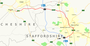 The A500 is a major primary A road in Staffordshire and Cheshire, England. It is dual carriageway for most of its length and connects Nantwich, junctions 16 and 15 of the M6 motorway with the city of Stoke-on-Trent. It is 19 miles (31 km) long.