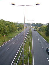 The A500 was initially built from the M6 at junction 16 to the A34 road at Talke as part of the motorway construction,[5] opening in 1962.[6] At the southern end, a dual carriageway was constructed from junction 15 of the M6 to the A34 near Trentham, given the number A5006,[5] and opened at the same time.[6] The northern section of the road was then subsequently extended from Talke to the A53 road. The final section from the A34 in the south to the A53 junction was built between 1974[2] and 1977.[4] The two middle junctions were to be grade separated, but due to financial constraints they were built as roundabouts.[7] Construction involved the destruction of streets and businesses within Stoke's town centre, as well as the excavation of a mass grave of the victims of a 17th-century cholera epidemic.[7] This final section was named Queensway,[2] and on its completion the whole route became the A500.