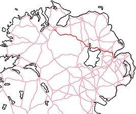 The A6 road in Northern Ireland runs for 71.4 miles (114.9km) from Belfast to Derry, via County Antrim and County Londonderry. From Belfast to Randalstown the route has been superseded by a motorway (the M2 and M22). Mostly single carriageway, there are sections of dual carriageway in Antrim town centre and from Randalstown to Toome, including the Toome bypass. In urban and suburban districts of Belfast and Derry the route is single carriageway with 4 lanes (2 lanes in each direction). In rural parts, there are numerous climbing lanes along the route. The A6 is one of Northern Ireland's most important arterial routes, as the road runs between its two largest cities and urban areas. Between Randalstown and Derry the road forms part of European route E16.