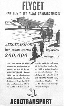 AB Aerotransport (ABA) was a Swedish government-owned airline which operated during the first half of the 20th Century and was merged into what would become the SAS Group. ABA was established on 27 March 1924 under the name Aktiebolaget Aerotransport by Carl and Adrian Florman together with Ernst Linder, John Björk och Johan Nilsson.[1] Its first flight was on 2 June 1924 between Stockholm, Sweden and Helsinki, Finland.[2][3] Needing more funds, it became government-owned in 1935.[1] ABA was merged with Swedish Intercontinental Airlines (SILA) in 1948 and airline operations would ultimately be merged into the international SAS Group in 1950.