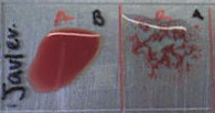 Student blood test. Three drops of blood are mixed with anti-B (left) and anti-A (right) serum. Agglutination on the right side indicates blood type A.