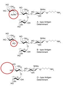 There are three basic variants of immunoglobulin antigens in humans that share a very similar chemical structure but are distinctly different. Red circles show where there are differences in chemical structure in the antigen-binding site (sometimes called the antibody-combining site) of human immunoglobulin. Notice the O-type antigen does not have a binding site.[29]