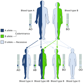 The table above summarizes the various blood groups that children may inherit from their parents.[32][33] Genotypes are shown in the second column and in small print for the offspring: AO and AA both test as type A; BO and BB test as type B. The four possibilities represent the combinations obtained when one allele is taken from each parent; each has a 25% chance, but some occur more than once. The text above them summarizes the outcomes.
