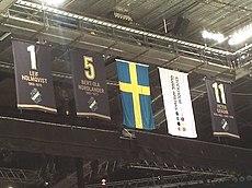 AIK finished in third place in the following season, eight points behind the winners, Färjestad.[13] AIK faced Färjestad in the semifinals. In Karlstad, AIK won 5–4 and had a great opportunity to qualify for another final game. At home at Hovet, AIK treated their supporters to a 4–0 win. The other team to reach the final was IF Björklöven, who finished in second in Elitserien. Four games were about to be played. AIK lost the first 0–2, but the following two games ended with AIK winning 3–2 and 4–3. The team now had a chance to win the championship at Hovet. Björklöven, though, took their last chance and won 4–2. The final fifth leg was played in Scandinavium in Gothenburg. AIK won 3–2 and became the Swedish champions for the first time in over 30 years.[16] The following season, Färjestad exacted their revenge in the semifinals by knocking out AIK with two wins to one.[17]