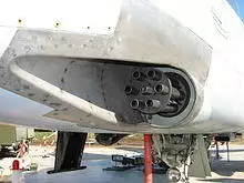 Various munitions could be mounted on the one centerline and four under-wing hardpoints, including bombs, missiles and rockets; payloads of up to 2,000 lb may be carried upon the centerline and the two innermost under-wing pylons, while the outer pylons can carry up to 1,000 lb.[8] All four of the under-wing hardpoints are plumbed for drop tanks to extend the aircraft's range, Italian aircraft are also fitted with a fixed aerial refueling probe.[11] Optical reconnaissance pods can be carried externally on the centerline hardpoint.[6] Wingtip rails are provided for infrared guided air-to-air missiles such as the AIM-9 Sidewinder and MAA-1 Piranha. Italian aircraft are fitted with a M61 Vulcan 20 mm rotary cannon on the port side of the lower fuselage.[8] The United States denied the sale of the M61 to Brazil, thus its AMXs are instead fitted with two 30 mm DEFA 554 revolver cannons.[9][14]