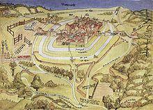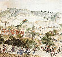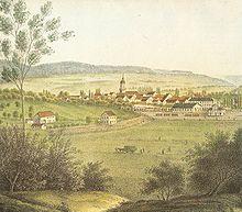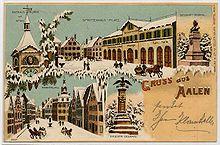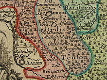 The first mention of Aalen was in 839, when emperor Louis the Pious reportedly permitted the Fulda monastery to exchange land with the Hammerstadt village, then known as Hamarstat.[24] Aalen itself was first mentioned in an inventory list of Ellwangen Abbey, dated ca. 1136, as the village Alon, along with a lower nobleman named Conrad of Aalen. This nobleman probably had his ancestral castle at a site south of today's town centre and was subject first to Ellwangen abbey, later to the House of Hohenstaufen, and eventually to the House of Oettingen. 1426 was the last time a member of that house was mentioned in connection with Aalen. Documents, from the Middle Ages, indicate that the town of Aalen was founded by the Hohenstaufen some time between 1241 and 1246, but at a different location than the earlier village, which was supposedly destroyed in 1388 during the war between the Alliance of Swabian Cities and the Dukes of Bavaria. Later, it is documented that the counts of Oettingen ruled the town in 1340. They are reported to have pawned the town to Count Eberhard II and subsequently to the House of Württemberg in 1358 or 1359 in exchange for an amount of money.[25]