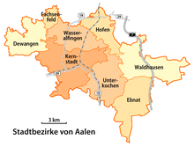 | Wasseralfingen | 15,97 | 11.767[17] | Affalterried, Brausenried, Bürgle, Erzhäusle, Heisenberg, Mäderhof, Onatsfeld, Rötenberg, Röthardt, Salchenhof, Treppach, Weidenfeld |