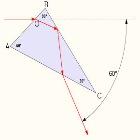 The prism consists of a block of glass forming a right prism with 30°–60°–90° triangular faces. When in use, a beam of light enters face AB, is refracted and undergoes total internal reflection from face BC, and is refracted again on exiting face AC. The prism is designed such that one particular wavelength of the light exits the prism at a deviation angle (relative to the light's original path) of exactly 60°. This is the minimum possible deviation of the prism, all other wavelengths being deviated by greater angles. By rotating the prism (in the plane of the diagram) around any point O on the face AB, the wavelength which is deviated by 60° can be selected.