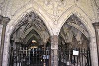 Westminster Abbey was founded in the tenth century by Saint Dunstan who established a community of Benedictine monks.[6] The only traces of St Dunstan's monastery remaining are round arches and massive supporting columns of the undercroft and the Pyx Chamber.[7]