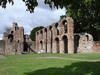 The cloister and buildings lie directly to the south of the church. Parallel to the nave, on the south side of the cloister, was a refectory, with a lavatory at the door.[4] On the eastern side, there was a dormitory, raised on a vaulted substructure and communicating with the south transept and a chapter house (meeting room). A small cloister lay to the south-east of the large cloister. Beyond that was an infirmary with a table hall and a refectory for those who were able to leave their chambers. At the west entrance to the Abbey, there was a house and a small courtyard for the abbot. [4]