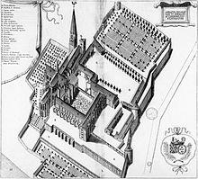 A monastery was established that followed the Benedictine rule.[4] In 850 Abbot Conrad, brother-in-law of Louis the Pious, had a crypt built. Attached to the crypt was a circular oratory. Conrad's nephew, Emperor Charles the Bald, was present at the translation of the relics of Germanus.[5] The abbey reached the apex of its cultural importance during the Carolingian era; the source for its early history is an account of the Miracula Sancti Germani Episcopi Autissiodorensis ("Miracles of Saint Germain, Bishop of Auxerre") written before ca. 880. The earliest surviving architectural remains are also of the ninth century.[6] The abbey had a noted school. From 876 to 883 Remigius of Auxerre was master of the school. Later, Thomas Becket studied there after completing his law courses in Bologna.[7] Monk and chronicler, Rodulfus Glaber, spent time at St Germain, where, he said, foreign monks were always accepted with respect.