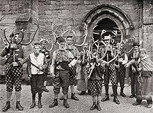 There are no recorded references to the horn dance prior to Robert Plot's Natural History of Staffordshire, written in 1686.[2] However, there is a record of the hobby horse being used in Abbots Bromley as early as 1532, and it is possible that the horn dance component of the custom was also present at that time but not commented upon by the writer.[3] A carbon analysis discovered that the antlers used in the dance date to the 11th century.[4] According to some, the use of antlers suggests an Anglo-Saxon origin along with other native Anglo-Saxon traditions that have survived into modern times in various forms.[5] It has been speculated, for example, that the dance originated in the pagan period and was connected with the ruling dynasty of Mercia, based some 15 miles away at Tamworth, who owned extensive hunting lands in Needwood Forest and Cannock Chase surrounding Abbots Bromley. On this theory, the royal forester would have organised sympathetic magic rituals to ensure a plentiful catch each year, a tradition that survived into Christian times and gradually came to be seen as affirming the villagers' hunting rights. Even when the lands were granted to Burton Abbey in 1004 a forester would still need to have been employed. By the 16th century, when the abbey was dissolved, this was a hereditary position with the title "Forester of Bentylee" (Bentylee being the wooded area of the parish). From then until the 19th century the dance remained the traditional prerogative of the Bentley family, eventually passing to the Fowell family in 1914. The Fowells continue to run it to this day.[6]