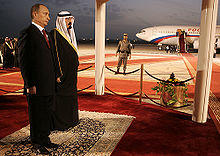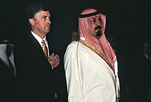 During his reign he maintained close relations with United States and United Kingdom and bought billions of dollars worth of defense equipment from both states.[3] He also gave women the right to vote for municipal councils and to compete in the Olympics.[4] Furthermore, Abdullah maintained the status quo when there were waves of protest in the kingdom during the Arab Spring.[5] In November 2013, a BBC report claimed that, due to the close relations it had with Pakistan, Saudi Arabia could obtain nuclear weapons at will from that country.[6] The King also had a longstanding relationship with Pakistan, and brokered a compromise between ousted Prime Minister Nawaz Sharif and General Pervez Musharraf, whom he had requested to be exiled to Saudi Arabia for a 10-year exile, following his ouster in the 1999 Pakistani coup d'état.[7]