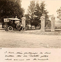 The secondary gates at Abercrombie House are much older than the house which was built in 1870. They were brought from Toxteth Park in Sydney which is now St Scholastica's College. Toxteth Park was built in 1829 so this is the probable date of these gates. Toxteth Park was the home of Sir George Wigram Allen who was the brother in law of Harriet Stewart, the wife of James Horne Stewart. The house was sold in 1901 to the Good Samaritan Sisters and they wished to bring the gates from their old convent in Pitt St which was being demolished.[10] The gates from Toxteth Park were no longer needed so they were transported to Abercrombie House. In the early 1900s Arthur Wigram Allen who was Harriet's nephew visited his relatives at Abercrombie house. Arthur's mother Lady (Marian) Allen was Harriet's sister. Arthur photographed the gates mentioning that they were from Toxteth Park. See photograph on the right.
