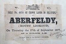 Aberfeldy was surveyed and proclaimed in 1885. It was initially known as Mount Lookout but was eventually renamed after the Scottish town of Aberfeldy.[7] At its peak, the township had a population of around 500. After the end of the gold rush the townsfolk depended for their livelihood upon sheep and cattle grazing and the production of potatoes and other crops.[8]