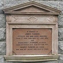 In 1879 Fleming secured a feu from the Earl of Fife on the land where he would build his new Aberlour distillery and on its completion produced whisky there from December 1880.[8] He sold the business to his acting agents, Robert Thorne & Sons in 1892.[9] James Fleming died aged 65, leaving a significant and tangible legacy. He built Aberlour's first public meeting place, The Fleming Hall in 1889.[10] This was followed in 1900 by the Fleming Cottage Hospital[11] providing isolation accommodation to limit the spread of infectious diseases. In James Thomson's 1902 book Recollections of a Speyside Parish[12] the author wrote: "The hospital that has been built and endowed by his [Fleming's] liberality will always remain a memorial to his Christian philanthropy. I can well remember more than one epidemic that devastated many a home in the village. Had there been at the time such an institution in the place, many lives might have been saved."