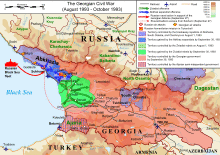Before the 1992 War, Georgians made up nearly half of Abkhazia's population, while less than one-fifth of the population was Abkhaz.[72] As the war progressed, confronted with hundreds of thousands of ethnic Georgians who were unwilling to leave their homes, the Abkhaz separatists implemented the process of ethnic cleansing in order to expel and eliminate the Georgian ethnic population in Abkhazia.[73][74] About 5,000 were killed, 400 went missing[75] and up to 250,000 ethnic Georgians were expelled from their homes.[76] Slightly over 200,000 Georgians remain displaced in Georgia proper.[77]