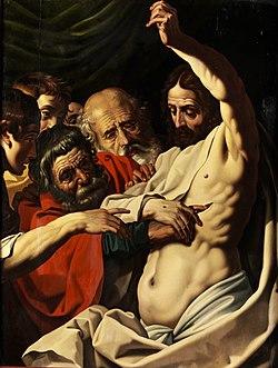 Other works dating to this overtly Caravaggesque period are the Allegory of the burdens of time (Royal Museums of Fine Arts of Belgium, 1609), Peace and plenty (Wolverhampton Art Gallery, 1614), which was also commissioned for the Antwerp city hall's Assembly Room, and The dead Christ in the tomb with two angels (Metropolitan Museum of Art, c. 1610).[14] The latter painting was likely commissioned as an altarpiece. This Caravaggesque composition predates comparable Dutch works such as Dirck van Baburen's Roman charity by a decade.[1]
