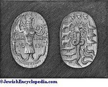 - Abrasax with Jewish symbols. This combination predominates, not indeed with symbolical figures, but in the form of inscriptions, such as: Iao, Eloai, Adonai, Sabaoth, Michael, Gabriel, Uriel, Onoel, Ananoel, Raphael, Japlael, and many others. The name ΙΑΩ, to which ΣΑΒΑΩΘ is sometimes added, is found with this figure even more frequently than ΑΒΡΑΣΑΞ, and they are often combined. Beside an Abrasax figure the following, for instance, is found: ΙΑΩ ΑΒΡΑΣΑΞ ΑΔΩΝ ΑΤΑ, "Iao Abrasax, thou art the Lord".[10] With the Abrasax-shield are also found the divine names Sabaoth Iao, Iao Abrasax, Adonai Abrasax, etc.[11]