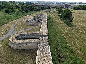 The fortifications with massive walls, 3 m (9.8 ft) thick and 12 m (39 ft) high, were built around the town on the south bank of the river in 320–330 under Constantine the Great, seemingly for immigrant "barbarians" (foederati) as part of the policy of pacifying them.[3]