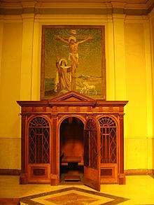 The second form of confession and absolution is known as "Holy Absolution", which is done privately to the pastor (commonly only upon request). Here the person confessing (known as the "penitent") confesses his individual sins and makes an act of contrition as the pastor, acting in persona Christi, announces this following formula of absolution (or similar): "In the stead and by the command of my Lord Jesus Christ I forgive you all your sins in the name of the Father and of the Son and of the Holy Spirit."[68] In the Lutheran Church, the pastor is bound by the Seal of the Confessional (similar to the Roman Catholic tradition). Luther's Small Catechism says "the pastor is pledged not to tell anyone else of sins told him in private confession, for those sins have been removed".[69]
