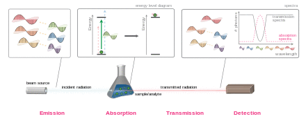 Precise measurements of the absorbance at many wavelengths allow the identification of a substance via absorption spectroscopy, where a sample is illuminated from one side, and the intensity of the light that exits from the sample in every direction is measured. A few examples of absorption are ultraviolet–visible spectroscopy, infrared spectroscopy, and X-ray absorption spectroscopy.