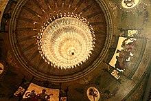 The interior might be considered an early example of American Baroque Revival architecture. The auditorium is graced by a large crystal chandelier, which measures 16 ft (4.9 m) in diameter, and weighs 5,000 lb (2,300 kg). When installed, the chandelier contained 240 gas jets, which were converted to electricity in 1900, and rewired in 1957. That same year, it was fitted with an electric-powered winch. It previously required 12 people working four-hours to lower it by hand. The fixture was restored to its original form and missing crystals replaced in 2008.[9] The heat produced by the original gas fixtures helped to ventilate the hall by causing air to rise to various vents along the back walls and in the center of the ceiling.