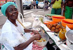Acarajé sold on the street in Brazil are variously made with fried beef, mutton, dried shrimp, pigweed, fufu osun sauce, and coconut.[4] Today in Bahia, Brazil, most street vendors who serve acarajé are women, easily recognizable by their all-white cotton dresses and headscarves and caps. They first appeared in Bahia selling acarajé in the 19th century. Earnings from the sale of acarajé were used both to buy the freedom of enslaved family members until the abolition of slavery in Brazil in 1888; its sale additionally served as a source of family income.[6] The city now has more than 500 acarajé vendors. The image of these women, often simply called baianas, frequently appears in artwork from the region of Bahia.[1][2][7] Acarajé, however, is available outside of the state of Bahia as well, including the streets of its neighborboring state of Sergipe, and the markets of Rio de Janeiro.[8]