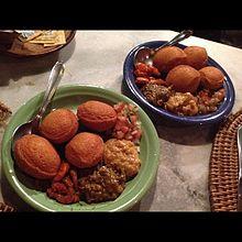 Àkàrà (Hausa: kosai, Portuguese: Acarajé (Portuguese pronunciation: [akaɾaˈʒɛ] ) is a type of fritter made from cowpeas. It is found throughout West African and Brazilian cuisines. The dish is traditionally encountered in Brazil's northeastern state of Bahia, especially in the city of Salvador. Acarajé serves as both a religious offering to the gods in the Candomblé religion and as street food.[1] The dish was brought by enslaved peoples from West Africa, and can still be found in various forms in Nigeria, Ghana, Togo, Benin, Mali, Gambia and Sierra Leone.[2]