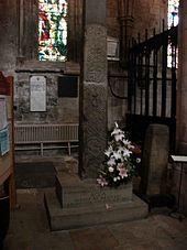 Acca was buried at Hexham near the east wall of the abbey. Two finely carved crosses, fragments of one of which still remain, were erected at the head and foot of his grave.[4] He was revered as a saint immediately after his death. His body was translated at least three times: in the early 11th century, by Alfred of Westow, sacrist of Durham;[4] in 1154, at the restoration of the church, when the relics of all the Hexham saints were put together in a single shrine; and again in 1240. His feast day is 20 October. The translation of his relics is commemorated on 19 February.