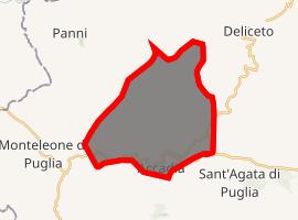 The town occupies a hilltop at 650 metres (2,130 ft) of elevation, in the Daunian Mountains along the Apennines. It is not far from Foggia on the rich agricultural plains of the Tavoliere delle Puglie in the east, nor from Naples to the west. Population increases in summer when many of its migrant labour force return home to take up temporary residence and visit family.