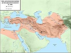 The Achaemenid Empire (/əˈkiːmənɪd/; Old Persian: , romanized: Xšāça, lit. 'The Empire'), also called the First Persian Empire,[16] was an ancient Iranian empire based in Western Asia founded by Cyrus the Great. Ranging at its greatest extent from the Balkans and Eastern Europe proper in the west to the Indus Valley in the east, it was larger than any previous empire in history, spanning 5.5 million square kilometers (2.1 million square miles).[12][13] It is notable for its successful model of a centralised, bureaucratic administration (through satraps under the King of Kings), for its multicultural policy, for building infrastructure such as road systems and a postal system, the use of an official language across its territories, and the development of civil services and a large professional army. The empire's successes inspired similar systems in later empires.[17]
