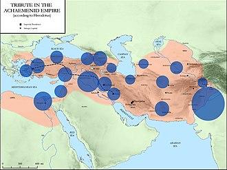 Part of the cause of the Empire's decline had been the heavy tax burden put upon the state, which eventually led to economic decline.[141][142] An estimate of the tribute imposed on the subject nations was up to U.S. $180M per year. This does not include the material goods and supplies that were supplied as taxes.[143] After the high overhead of government—the military, the bureaucracy, whatever the satraps could safely dip into the coffers for themselves—this money went into the royal treasury. According to Diodorus, at Persepolis, Alexander III found some 180,000 Attic talents of silver besides the additional treasure the Macedonians were carrying that already had been seized in Damascus by Parmenion.[144] This amounted to U.S. $2.7B. On top of this, Darius III had taken 8,000 talents with him on his flight to the north.[143] Alexander put this static hoard back into the economy, and upon his death some 130,000 talents had been spent on the building of cities, dockyards, temples, and the payment of the troops, besides the ordinary government expenses.[145] Additionally, one of the satraps, Harpalus, had made off to Greece with some 6,000 talents, which Athens used to rebuild its economy after seizing it during the struggles with the Corinthian League.[146] Due to the flood of money from Alexander's hoard entering Greece, however, a disruption in the economy occurred, in agriculture, banking, rents, the great increase in mercenary soldiers that cash allowed the wealthy, and an increase in piracy.[147]