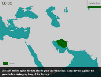 Cyrus revolted against the Median Empire in 553 BC, and in 550 BC succeeded in defeating the Medes, capturing Astyages and taking the Median capital city of Ecbatana.[33][34][35] Once in control of Ecbatana, Cyrus styled himself as the successor to Astyages and assumed control of the entire empire.[36] By inheriting Astyages' empire, he also inherited the territorial conflicts the Medes had had with both Lydia and the Neo-Babylonian Empire.[37]