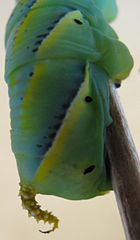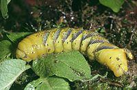 There are several generations of Acherontia atropos per year, with continuous broods in Africa. In the northern parts of its range the species overwinters in the pupal stage. Eggs are laid singly under old leaves of Solanaceae: potato especially, but also Physalis and other nightshades. However it also has been recorded on members of the Verbenaceae, e.g. Lantana, and on members of the families Cannabaceae, Oleaceae,[9] Pedaliaceae and others. The larvae are stout with a posterior horn, as is typical of larvae of the Sphingidae. Most sphingid larvae however, have fairly smooth posterior horns, possibly with a simple curve, either upward or downward. In contrast, Acherontia species and certain relatives bear a posterior horn embossed with round projections about the thicker part. The horn itself bends downwards near the base, but curls upwards towards the tip.