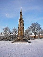 In the middle of the quadrangle, known as The Square,[1] Akroyd had a monument called the Victoria Cross built in 1875 and dedicated to Queen Victoria. Its inscription includes a long quotation from William Wordsworth's poem "The Excursion".[2] The monument, similar in style to an Eleanor Cross, has been described as "a monument to the British constitution".[3]