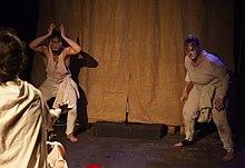 The conventions that govern acting in general are related to structured forms of play, which involve, in each specific experience, "rules of the game."[13] This aspect was first explored by Johan Huizinga (in Homo Ludens, 1938) and Roger Caillois (in Man, Play and Games, 1958).[14] Caillois, for example, distinguishes four aspects of play relevant to acting: mimesis (simulation), agon (conflict or competition), alea (chance), and illinx (vertigo, or "vertiginous psychological situations" involving the spectator's identification or catharsis).[13] This connection with play as an activity was first proposed by Aristotle in his Poetics, in which he defines the desire to imitate in play as an essential part of being human and our first means of learning as children: