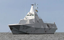 Ships have also adopted similar methods. Though the earlier Arleigh Burke-class destroyer incorporated some signature-reduction features.[32][33] the Norwegian Skjold-class corvette was the first coastal defence and the French La Fayette-class frigate the first ocean-going stealth ship to enter service. Other examples are the Taiwanese Tuo Chiang stealth corvette, German Sachsen-class frigates, the Swedish Visby-class corvette, the USS San Antonio amphibious transport dock, and most modern warship designs.