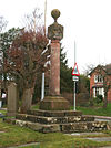 A sundial dating from the late 17th century stands in the churchyard; it is mentioned in records of 1704 and is known to have been moved sometime after 1774.[57] Of an unusual construction, with a long octagonal shaft capped with a ball finial, the sundial is believed to have originated as a medieval cross, perhaps destroyed under the Puritan government.[8][58][59] It was originally decorated, with the ball being painted as a globe and the shaft having gold and black banding, and bore the twin inscriptions "Tempus Fugit: Mors Venit (Time flies, death comes)" and "Ut Hora: Sic Vita (As the hour, so life)".[57] It is grade II listed and also designated a Scheduled Ancient Monument.[59][60] Cricketer and rugby player A. N. Hornby is buried in the churchyard; his grave features a carving of a wicket, bat and ball in marble.[61]