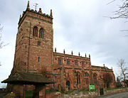 The red sandstone parish church is dedicated to St Mary the Virgin; it is listed at grade I. The tower dates originally from the 13th century, or a little earlier, and is one of the earliest in Cheshire.[53][54][55] Much of the remainder of the church dates from the 15th century, although the chantry was endowed in 1398 and the north aisle windows are 14th century.[54][56] In 1757, the top of the tower collapsed during a storm and was rebuilt 4 metres (13 ft) shorter in Early Gothic Revival style.[53][55] The interior features carvings thought to date from the late 10th century, a Norman font, a stone bench around the walls, monuments to Sir William Mainwaring and Sir Richard Wilbraham and his wife, as well as Victorian stained glass by Charles Kempe.[53][54][55]