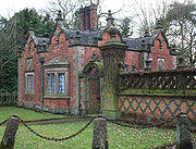 Several other buildings within the park are listed at grade II. The oldest of these is an icehouse with a circular brick-lined underground chamber which probably dates from the late 18th century.[48] Several structures that are now listed date from the 1861–2 works to the grounds. The Jacobean-style gate lodge on Chester Road is in red brick with stone dressings and blue brick decoration.[49] The clock tower over the carriage house features stone frames to the clock dials and is topped by a wooden finial with a weather vane.[50] A large iron statue of a mastiff with puppies oversetting a food bowl stands in the forecourt of the hall; it is attributed to Pierre Louis Rouillard and came from the Paris Exhibition of 1855.[51][52]